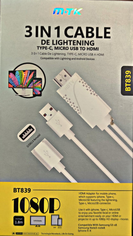 BT839 3 IN 1 IPHONE / MICRO USB / TYPE C TO HDMI CABLE (MOBILE AND TABLETS TO TV) 1080P, WHITE